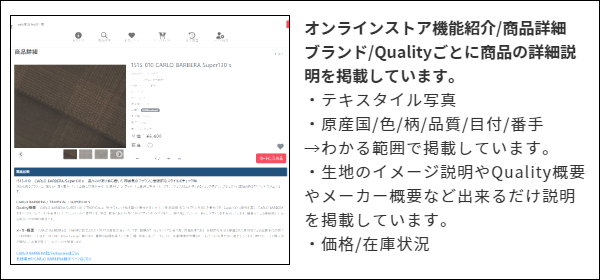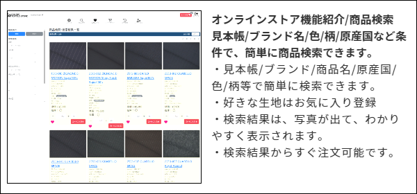 ・サンプル請求:実際に生地を確認いただけるようにサンプル請求機能も今後準備してまいります。