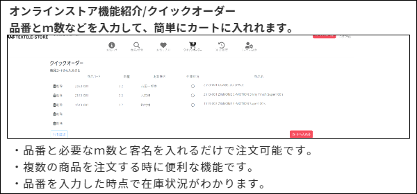 ・簡単注文:ご希望のテキスタイルとサイズを選択するだけで、簡単にご注文いただけます。品番わかればクイック注文画面も準備しております。