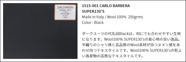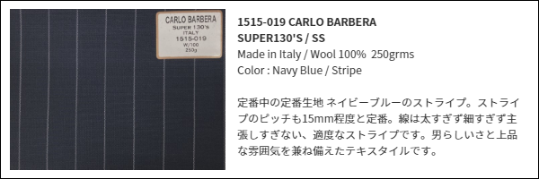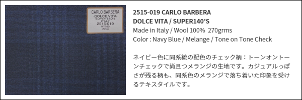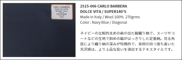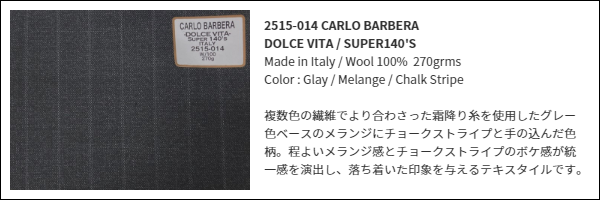 【CARLO BARBERA/SUPER140’S DOLCE VITA】は、昨今ストレッチ性を謳った素材が多い中で、原点回帰をコンセプトに作成した素材です。