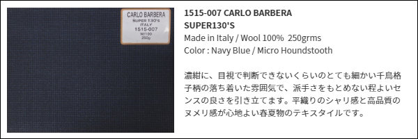 Super130’ s原料を基に、CARLO BARBERAのオリジナル コレクションを参考にしたクラシック・スーツ素材です。柄は、数多くあるアーカイブからデザインのアイデアをだし、現代風にアレンジし、新しいデザインを生み出しています。